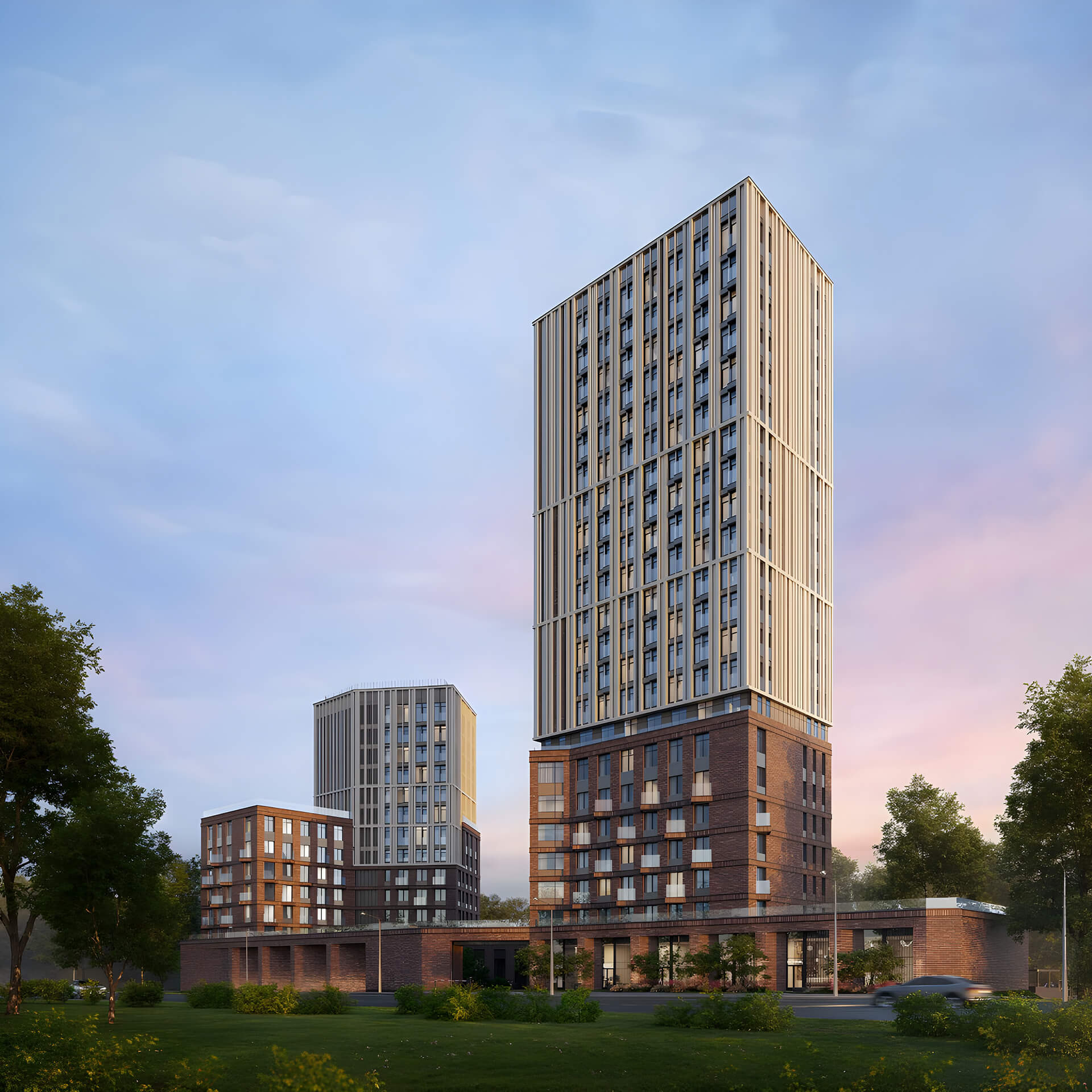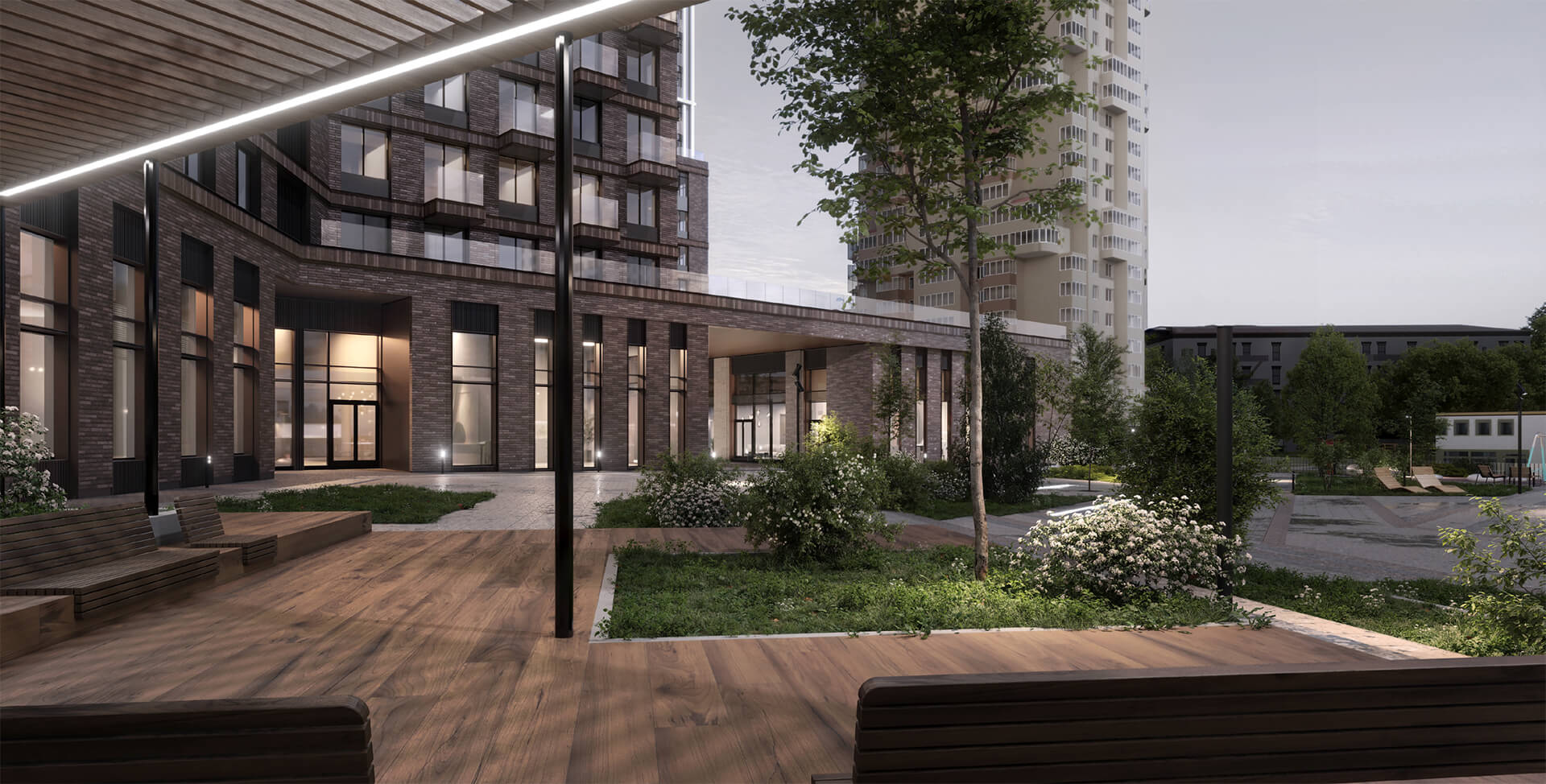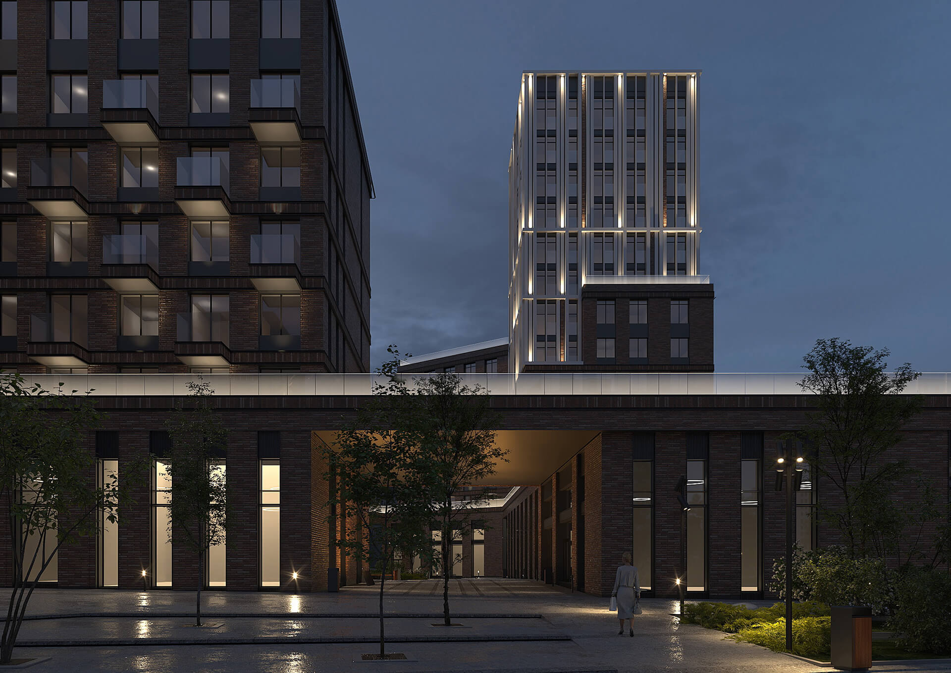 Особое внимание уделено вечернему облику Sokolinn Park. Архитектурная подсветка в тёплой гамме подчёркивает ключевые элементы зданий, создавая уютную и узнаваемую атмосферу. Благодаря гармоничному освещению фасады выглядят выразительно и в тёмное время суток, а сам комплекс становится полноценной частью городского пейзажа. Это архитектура, в которой хочется жить.