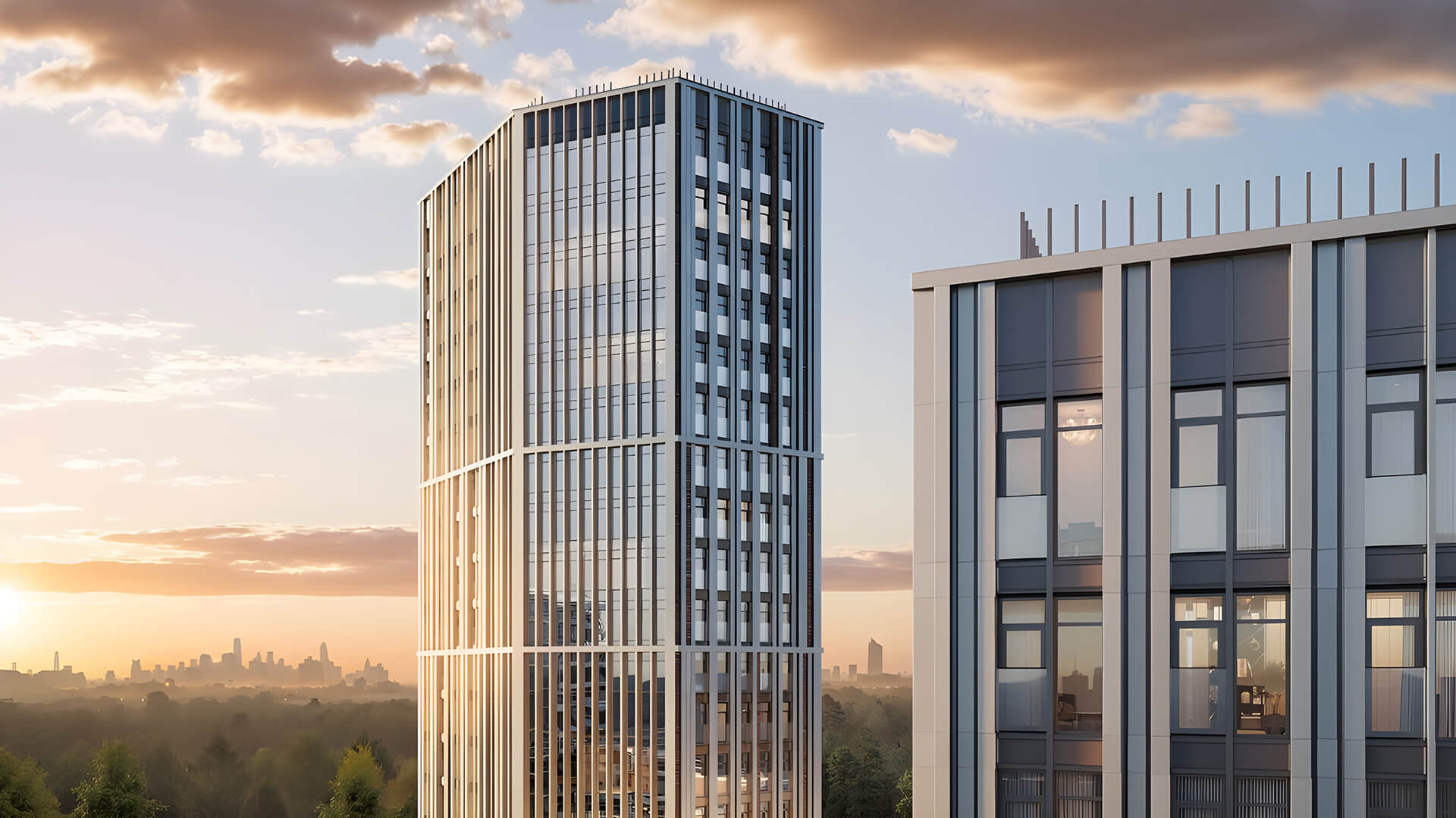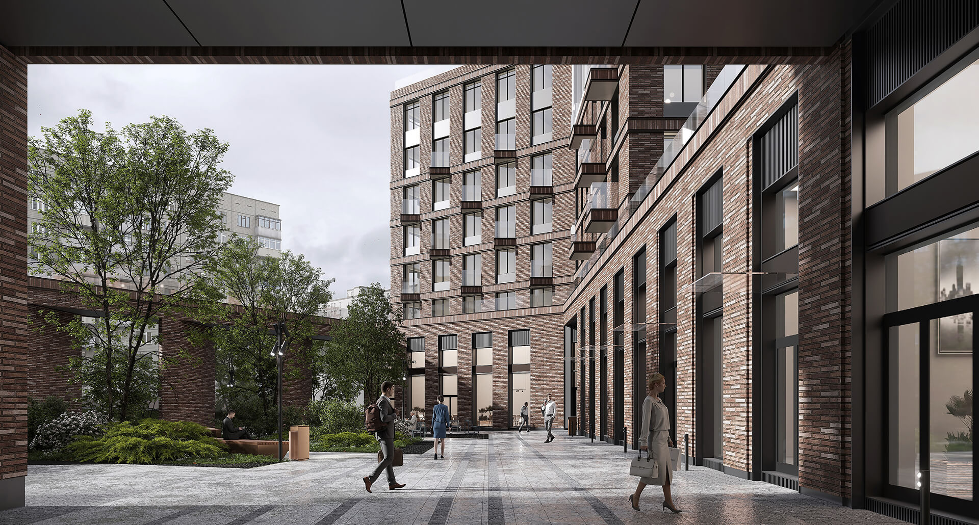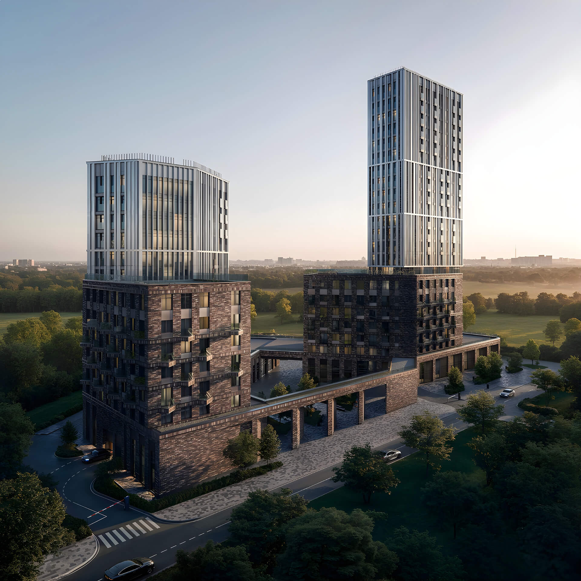 Особое внимание уделено вечернему облику Sokolinn Park. Архитектурная подсветка в тёплой гамме подчёркивает ключевые элементы зданий, создавая уютную и узнаваемую атмосферу. Благодаря гармоничному освещению фасады выглядят выразительно и в тёмное время суток, а сам комплекс становится полноценной частью городского пейзажа. Это архитектура, в которой хочется жить.