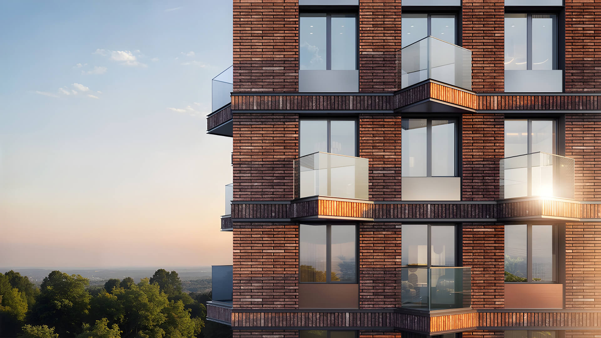 Панорамные окна и французские балконы делают фасады легкими и светлыми, одновременно открывая жильцам великолепные виды на зелёные массивы и внутренний двор-парк. Визуальный ритм архитектуры придаёт комплексу динамичность, а продуманная геометрия создаёт ощущение приватности даже в центре мегаполиса. Все элементы выполнены с вниманием к деталям: от формы окон до линий остекления и архитектурной подсветки.