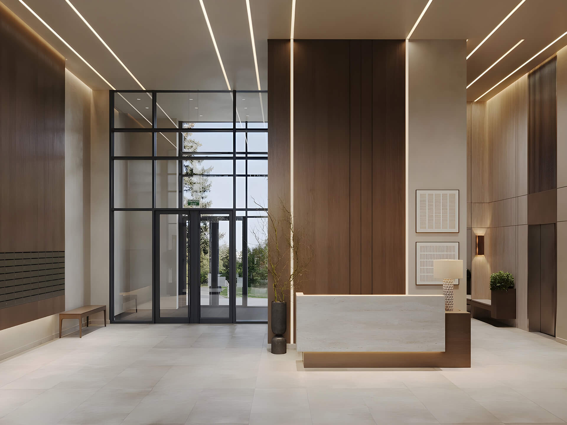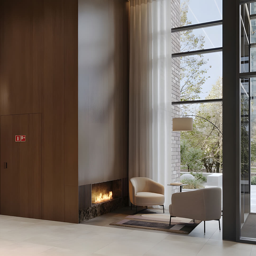 В каждом корпусе предусмотрено дизайнерское оформление входной зоны с зоной ресепшн и возможностью отдыха. Простор и высокие потолки создают эффект воздушности, а панорамное остекление визуально открывает лобби во внутренний двор, насыщая его светом и ощущением природного продолжения. Зонирование пространства даёт возможность одновременно уединиться и быть в комфортном взаимодействии с другими жильцами. Всё это создаёт обстановку, сопоставимую с атмосферой бутик-отеля.